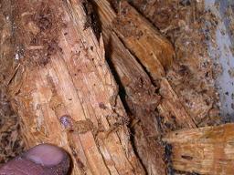 木をエイッと縦に割ると中から幼虫や卵が出てきます
