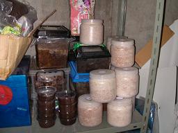 菌糸ビンとは、クヌギの木を細かく粉砕したものに平茸(ヒラタケ)?の菌をしみこませた物です。