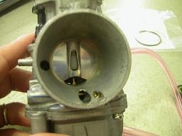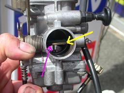 4スト純正キャブの、スロットルで動くバルブはバタフライバルブ(黄色の←)ですが、ここを開けてもガソリンは吸い出されてきません。
