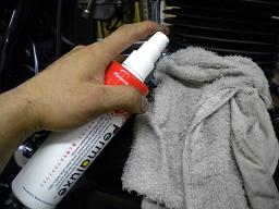 固く絞ったタオルにスプレーし、タンク・シート・エンジン・タイヤなど、どこでも磨くとツヤツヤになって撥水し、紫外線による色あせやひび割れなどを防いでくれます |