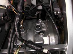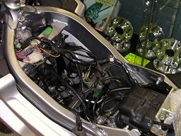 まずは、タンクを外し、カバー上部にあるサーモスタットを外す為、LLCを抜いておきます
