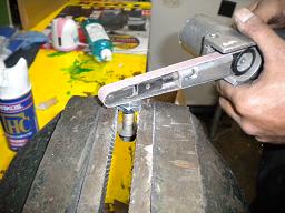 かなり硬いので刃がダメにならないようにモリブデン系のスプレーをしながら、作業をすすめ、根元付近までネジきります |