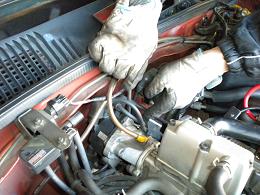 そしてタイミングライトを1番プラグコードにつないでチェックします |