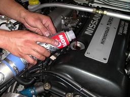 続いてエンジンクリーンです。交換前のオイルに入れます。約15分アイドリングをすることで、エンジン内部にこびりついたカーボン・スラッジを溶かして落とします。