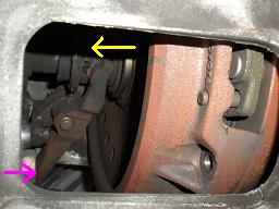 クラッチを踏むとピンクの方向にプッシュロッドが押します。するとシーソーの原理でクラッチのベアリングが黄色方向に引かれます