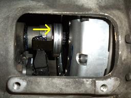 クラッチペダルを踏むと、マスターシリンダーで発生した油圧がここのシリンダーに入っているピストン&プッシュロッドを→方向へ押します