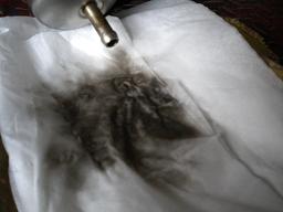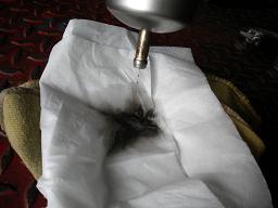 外したフィルターに溜まっているガソリンを、綺麗なウエスに垂らしてみると、ほら・・・こんなに汚いのが・・・