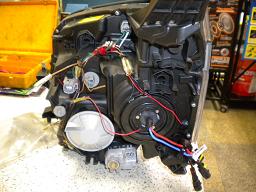 カバーの移植と同時に、純正バラスト・バルブ類の移植、ウインカーやイカリングの配線処理を行います |