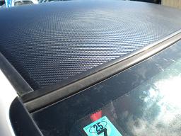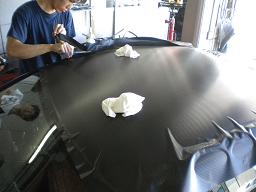 この車の場合、ルーフのサイドに付くモールは脱着式になっているので、それが付く窪みに綺麗に張り合わせます