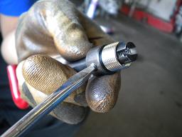 まずは専用のタップ切りを広がった穴に真っ直ぐ当てて、ねじ込んでいきます
