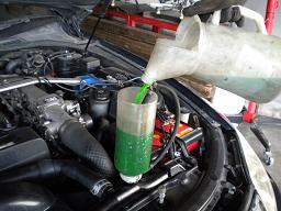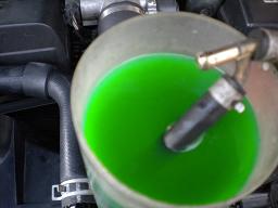 ウチでは1JZみたいな鉄ブロックの車の場合、赤いLLCだと錆びなのかLLCの色なのか判別し難いので緑を入れています |