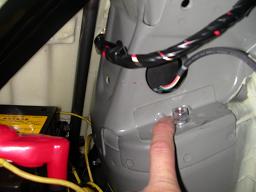 足元のカーペットをめくり、エンジンルーム内からの配線を処理しています