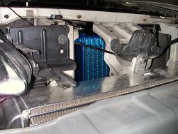 ボンネットフードのロック裏に着くトラストのOILクーラー16段です