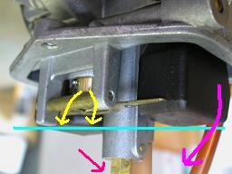 そのストローの先端が下の赤い矢印部です。 充分なガソリンを吸い取る事が出来るよう一定の量に保つ為に、黒い浮き(フロート)があります。ガソリンが減るとフロートが下がります。するとフロートに固定されたバルブが作動し、ガソリンが流れ出てくる仕組みです |
