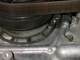 プーリー右側に水色に塗った出っ張りがあります。そこがクランクセンサーの僅か下の場所に位置します。